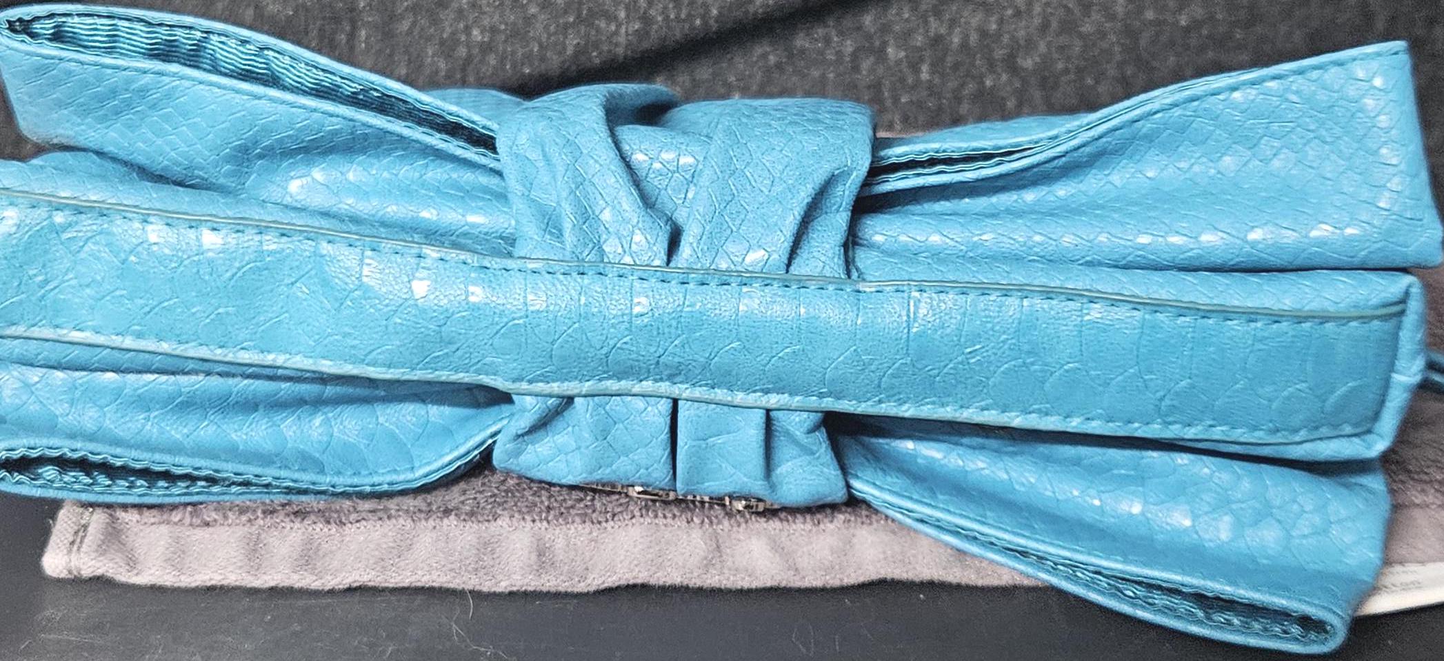 This vintage handbag is brand new and never used. It is made of genuine leather and features a turquoise color with silver hardware. The bag has a beautiful bow shape with the snap on the top, and the interior is lined with a soft, silky material. This bag is perfect for carrying your essentials, whether you are going out for a night on the town or just running errands .Comes with matching wallet and keychain.
